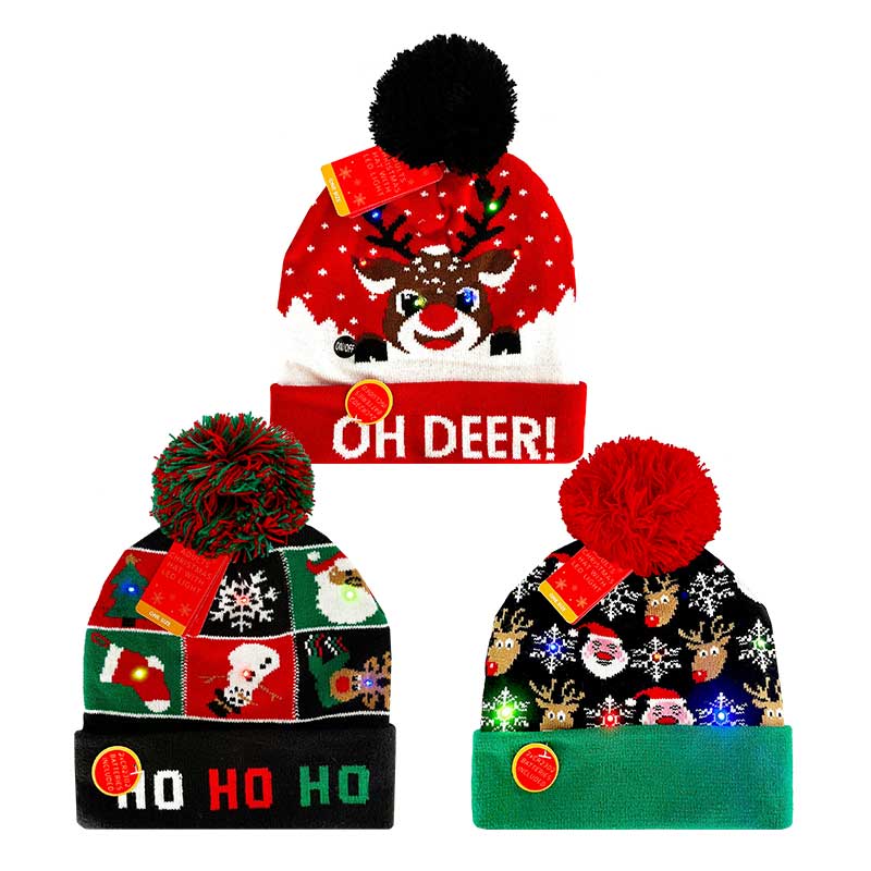 Bring extra cheer to the holidays with these adult Christmas hats featuring bright LED lights and a variety of colourful festive patterns. Each hat combines soft cosy fabric with playful seasonal designs from snowflakes to reindeer and more. The built in lights add a twinkling touch powered by a simple switch and hidden battery pack. Great for parties fancy dress events or Christmas jumper days these hats are a fun and easy way to show your festive spirit in style.