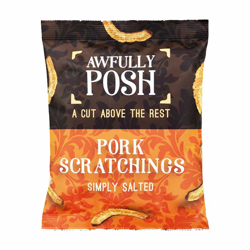 Awfully Posh Pork Scratchings Simply Salted 40g. Classic crunchy pork snack with sea salt. 0% VAT.