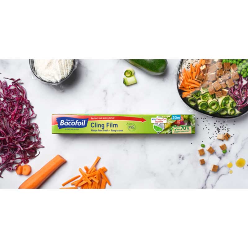 Bacofoil PVC Free Cling Film is a versatile kitchen essential, ideal for wrapping food to keep it fresh. Measuring 32.5cm in width and 20m in length, it offers ample coverage for various dishes. This eco-friendly option is made without PVC, making it safer for the environment and the new Easy-Cut System which now includes a new curved blade to improve the cutting of the film, ensuring a perfect cut every time and less wastage. Perfect for storing leftovers, meal prep, or wrapping sandwiches, it ensures a great seal for optimal freshness.