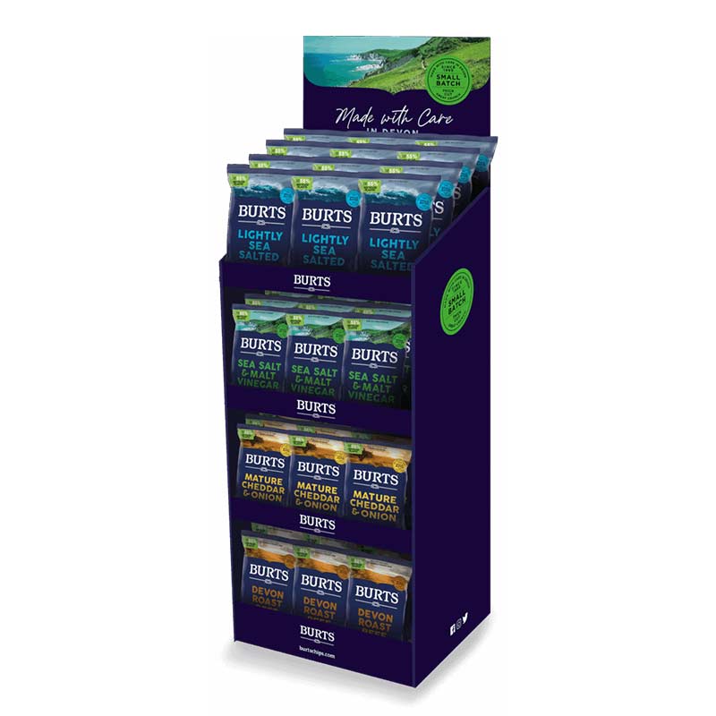 Burts Chips Floor Display Stand is the perfect retail solution for showcasing Burts hand-cooked British Chips in a bold and professional way. This freestanding, branded unit is designed to hold a variety of Burts flavours and pack sizes, making it ideal for convenience stores, farm shops, and catering outlets. With its eye-catching design and sturdy cardboard construction, it helps maximise product visibility and drive impulse purchases.