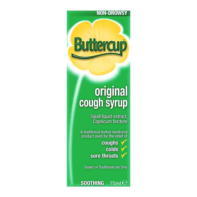 Buttercup Original Cough Syrup 75ml is a traditional remedy designed to help relieve dry, tickly coughs and soothe irritation in the throat. Its gentle yet effective formula works by coating the throat, helping to calm coughing and reduce discomfort.
