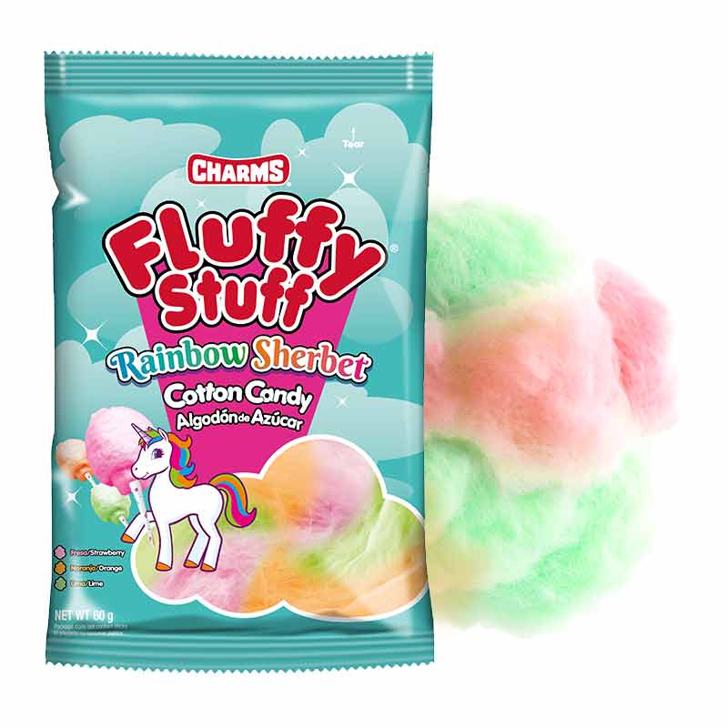Charms Fluffy Stuff Rainbow Sherbet Cotton Candy is a light and fluffy treat bursting with bright rainbow sherbet flavour. Each 60g tub is filled with soft, melt in the mouth cotton candy that delivers a sweet and colourful taste experience.