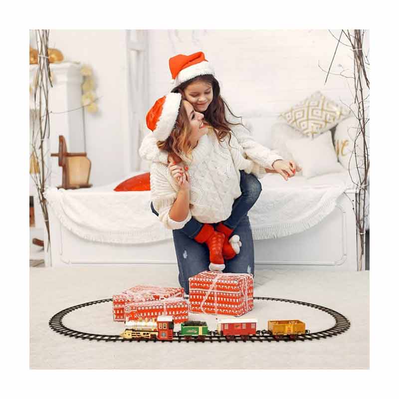 Festively themed, this Christmas Train Set features realistic sounds with colourful carriages that chug along a 3.3 metre track, adding holiday cheer to your decorations with lights and sounds for a magical experience.