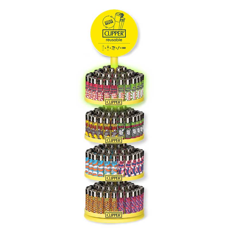 Clipper 4 Tier Carousel display stand holds up to 192 lighters in total. Displays comes with 144 Clipper lighters plus 48 FREE, that's a whole tier prefilled.