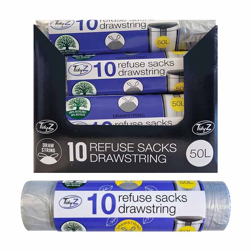 This drawstring refuse sack roll is designed for easy waste disposal, featuring a sturdy construction to handle various types of trash. The convenient drawstring closure allows for secure tying and effortless transport. Ideal for home, office, or outdoor use, these sacks are perfect for keeping your space tidy and organised. Their compact display makes them easy to store and access when needed.