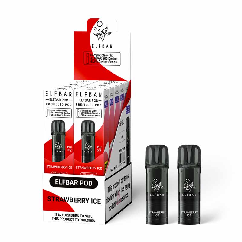 Elf Bar 600 Strawberry Ice Prefilled Pods 2 Pack 2ml capacity, 20mg nicotine salt, up to 600 puffs per pod, compatible with Elf Bar 600 Pod Kit.