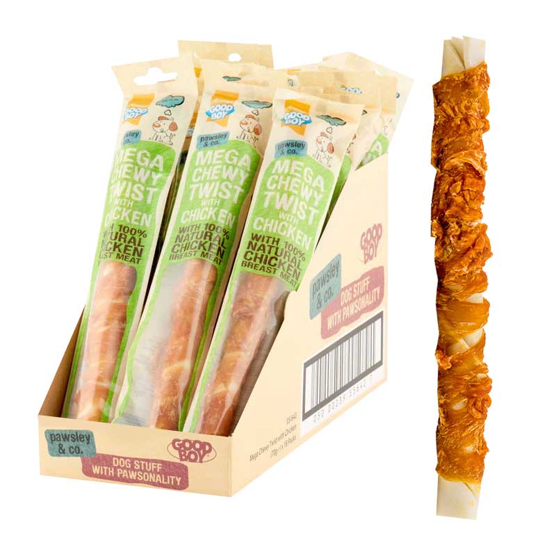 This display contains 18 packs of Good Boy Mega Chicken Twist, each 70g and made with real chicken for a delicious, chewy treat. The larger twist is perfect for satisfying natural chewing instincts while keeping dogs entertained. Ideal for retail displays, this popular chew is a great choice for rewarding and treating dogs.