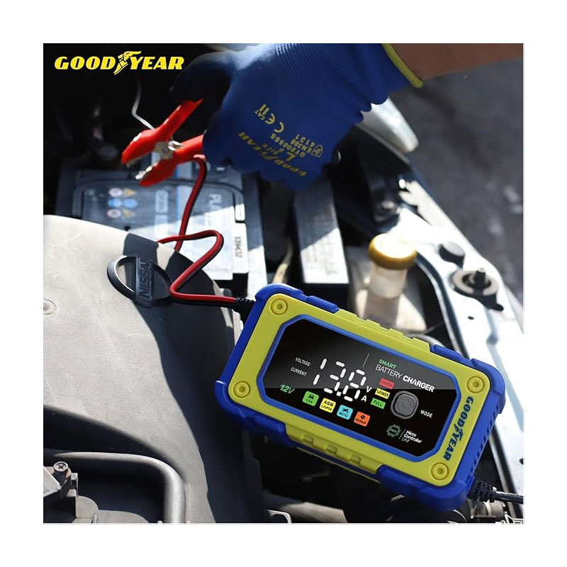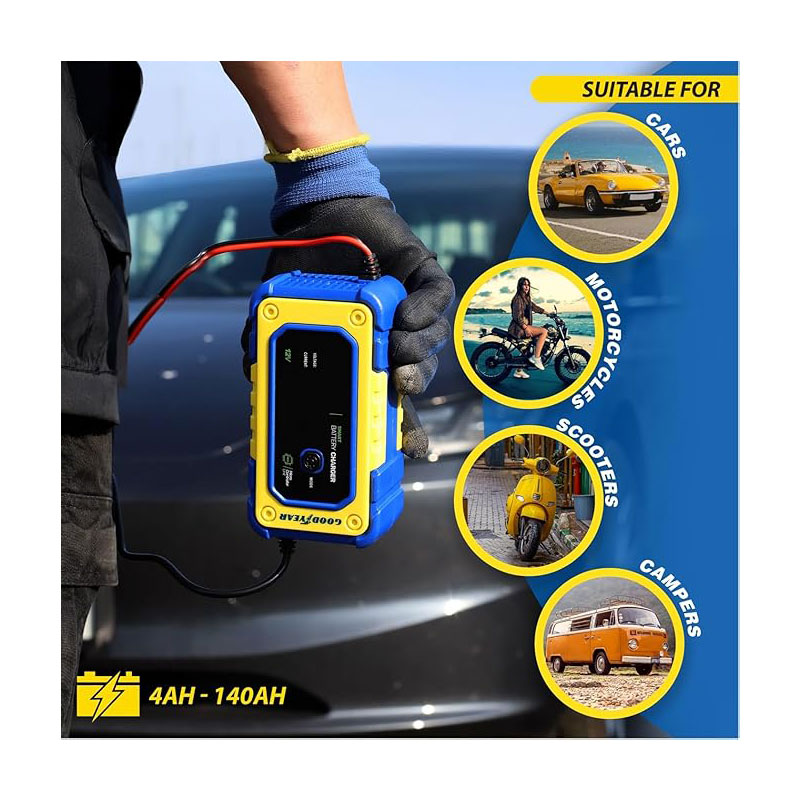 The Goodyear 12V 7A Smart Battery Charger is a high performance fully automatic charger designed to keep your vehicle battery in optimal condition. Its intelligent microprocessor ensures efficient accurate charging across four versatile modes including standard fast maintenance and repair. This makes it suitable for many battery types such as calcium gel AGM wet lead acid and LiFePO4 giving you a dependable all in one solution for everyday charging and long term care.