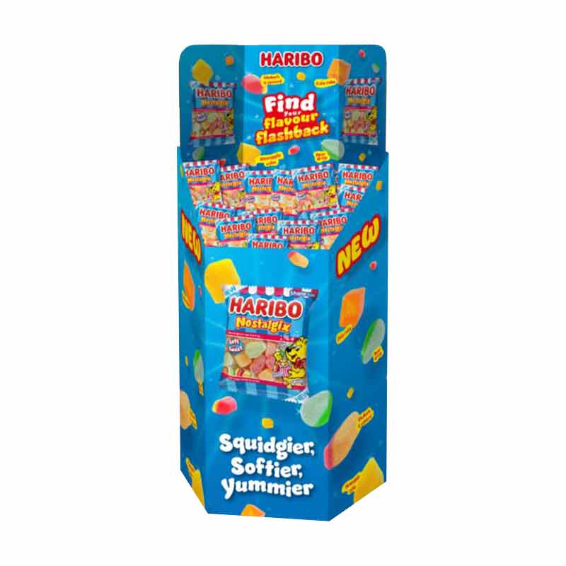 The Haribo Dump Bin Nostalgix is a fun and eye-catching display unit designed to showcase everyone’s favourite sweets in true retro style. Featuring the classic Haribo branding and bright, nostalgic design, this dump bin adds a playful touch to any retail space while drawing attention to impulse buys. Perfect for floor placement, it offers generous space for a variety of Haribo products, keeping your display organised and inviting.
