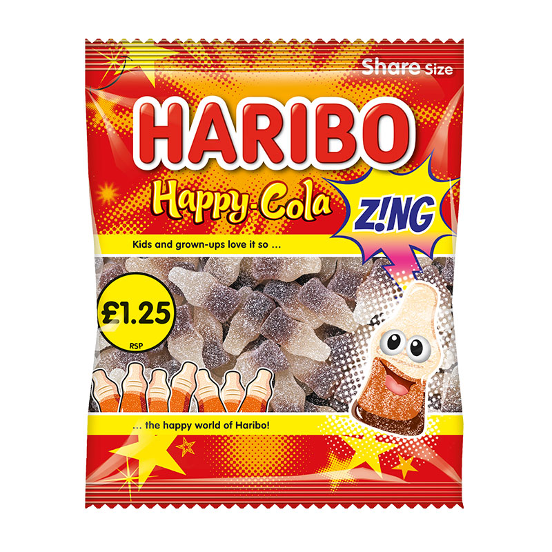 Haribo Happy Cola Zing offers a delightful blend of sweet and tangy cola-flavoured gummy candies. Each piece is shaped like miniature cola bottles, providing a fun and nostalgic treat. Perfect for sharing or enjoying on your own, these chewy gummies are bursting with flavour and are sure to satisfy your cravings for a fizzy, cola-inspired snack. Enjoy the playful taste of Happy Cola Zing anytime!