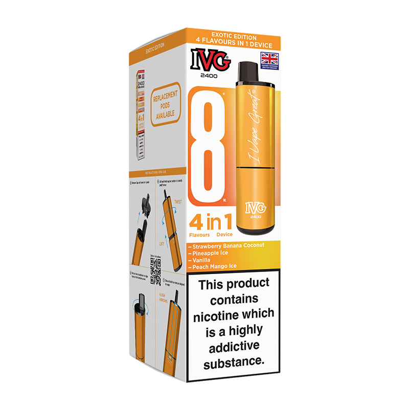 Experience bold flavours with the IVG 2400 4in1 Rechargeable Exotic Edition. Designed for convenience, this device offers a satisfying vaping experience with a high nicotine strength. Its sleek design makes it easy to carry, while the variety of exotic flavours ensures a delightful taste. Perfect for on-the-go vaping, this disposable device is a great choice for both new and seasoned users looking for a hassle-free option.