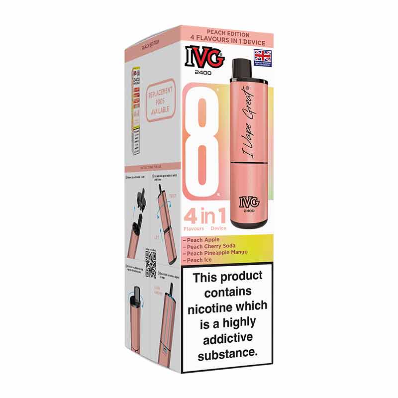 The IVG 2400 4in1 Rechargeable Peach Edition offers a sweet, fruity vaping experience with a smooth 20mg nicotine blend, perfect for on the go enjoyment. Convenient and user-friendly!