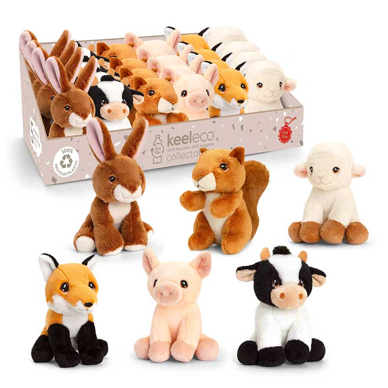 Keeleco Farm and Woodland Animals in Cardboard Display is a charming collection of eco friendly soft toys, perfect for retail presentation and gifting. Each toy measures approximately 12 cm in height and includes a delightful assortment of animals such as a fox, cow, sheep, squirrel, pig, and rabbit. Part of the Keeleco Farm collection, these soft toys are made and filled with 100 percent recycled polyester created from plastic waste, helping to reduce environmental impact while maintaining a luxuriously soft finish. Designed with embroidered eyes and detailing, they are gentle and safe, making them suitable from birth. Supplied in a convenient cardboard display, this set is ideal for shop floors and counters, allowing for easy merchandising and an attractive presentation. CE and UKCA marked, these toys meet recognised safety standards and are intended for ages 3 years and above, making them a perfect combination of sustainability, quality, and adorable design.