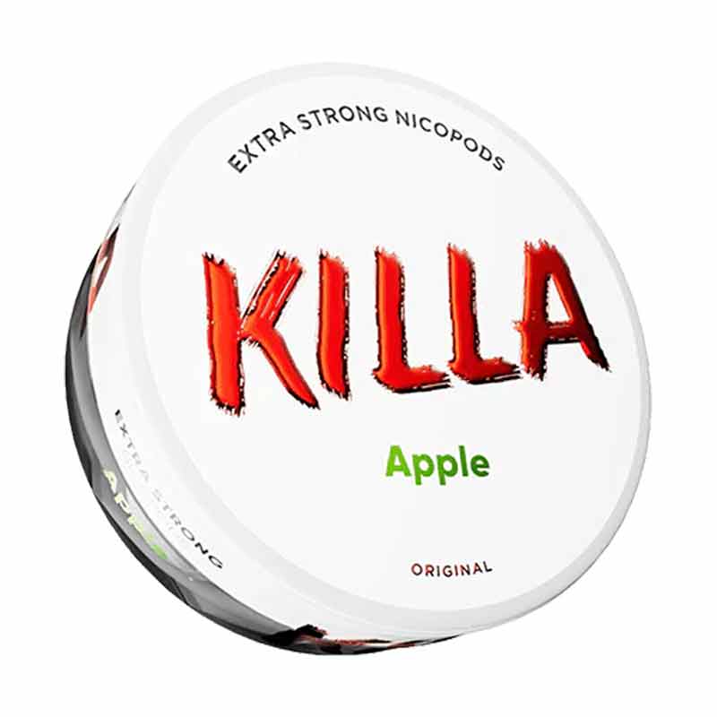 Killa Apple nicotine pouches delivering a crisp apple flavour with a strong 16mg nicotine strength. Supplied in a pack of 10 cans.