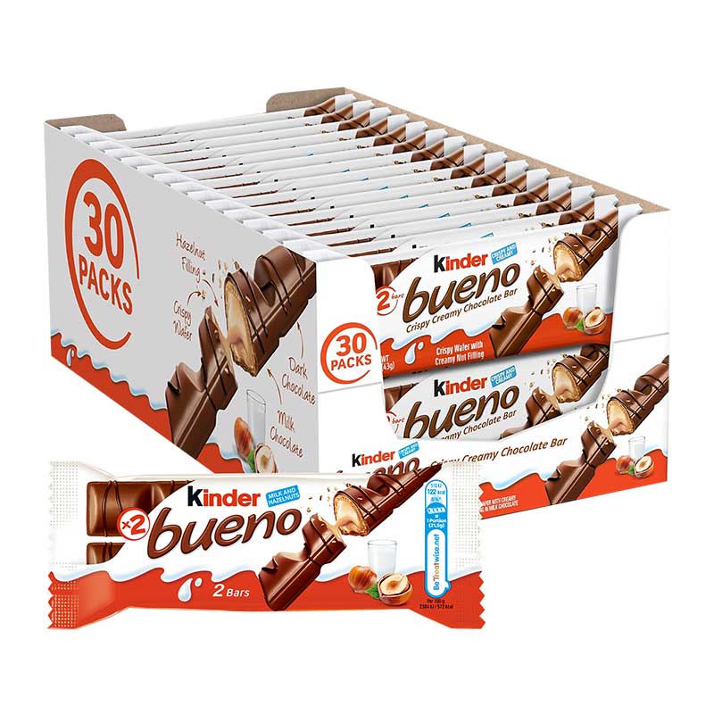 This display box contains 30 Kinder Bueno Twin Bars, each 43g, combining smooth hazelnut cream, crisp wafer, and milk chocolate coating. Perfect for impulse sales, snack counters, or gifting, Kinder Bueno offers a light, indulgent treat that consistently delights customers and encourages repeat purchases.