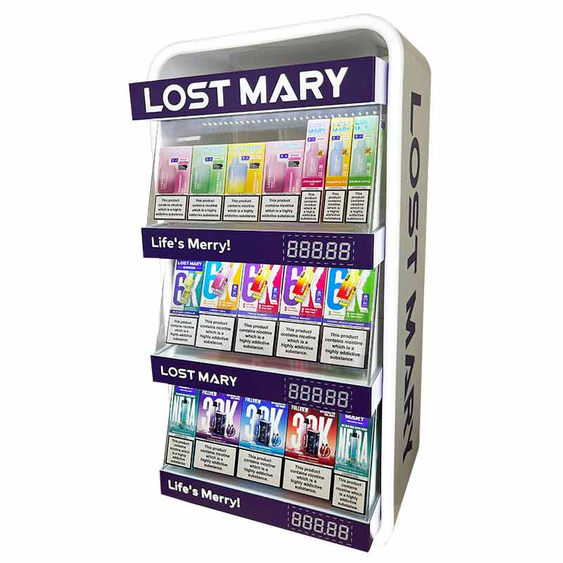 Showcase Lost Mary products in style with this 3-tier light-up counter display featuring shelf lighting and a ring light, complete with mains power plug.