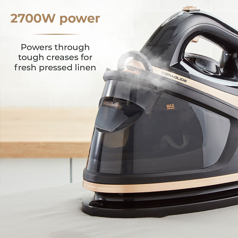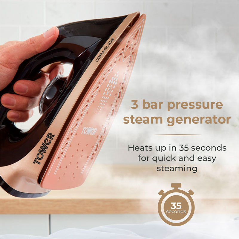 The Tower Ceraglide Steam Generator Iron 2700w delivers powerful performance and effortless ironing results. With its 2700 watt power output, this iron heats up quickly and maintains consistent high temperature for smooth and fast crease removal. The ceramic glide soleplate ensures excellent fabric protection and easy movement across all types of materials. Its steam generator system provides continuous powerful steam for tackling tough wrinkles with minimal effort. The iron also features a large water tank for extended ironing sessions without frequent refills and an ergonomic handle for comfortable use. Designed for efficiency and reliability, the Tower Ceraglide Steam Generator Iron 2700w combines modern technology with practical design to make everyday ironing easier and more effective.